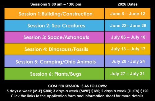 This morning camp is for children 3 through 6 years old who have not yet attended kindergarten. Children must be potty trained and 3 years old by the start of their session. Parents may sign children up for one or more sessions. Children may attend 5 days a week (M-F), 3 days a week (M/W/F) or 2 days a week (T/H). Camp starts at 9:00 a.m. and ends at 1:00 p.m.